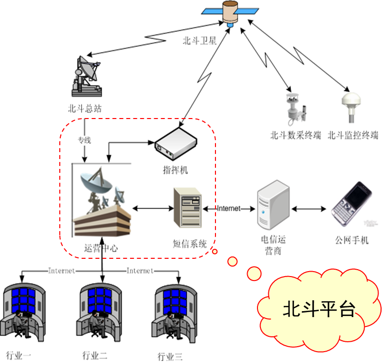北斗业务系统框架如下图所示;其中,运营中心、短信系统、北斗指挥机等构成北斗业务运营平台,可为用户提供监控及短信息通信等服务基于北斗卫星的短报文通信功能,在地面移动通信网络覆盖不到或覆盖较差的地域开展移动目标监控业务和短报文通信业务,能够为用户提供监控、导航、数据采集和短报文传输等务。